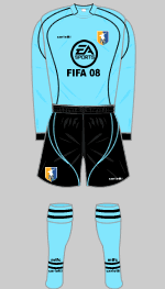 2007 marks Rochdale's centenary and for the occasion, the club has adopted a black and white kit modelled on their first ever playing strip as well as a commemorative badge. When playing away from home, black shorts are sometimes worn with the stripes. A touch of the more familiar blue is retained in their third kit.