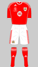 After four seasons with Puma, Bristol City have switched to their rivals, Adidas. The result is a straightforward strip in City's traditional red and white, reversed for the away kit so all elements can swapped when necessary. The third kit is a straightforward all-black version of the same template. The special kit was worn to mark the last game that Steve Lansdown was in charge as club chairman, the shirts being auctioned off afterwards.