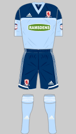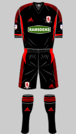 Once again Boro have made a virtue out of necessity by choosing a kit from the Adidas catalogue that bears a passing resemblance to an old favourite, in this instance the iconic chest band introduced by Jack Charlton in 1973. When required to change, a strip in two shades of blue with white trim is available and the black away strip from last season serves as third choice.