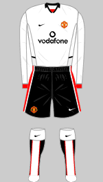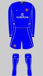 The following season, 2002-03, Nike became United's kit partner in a world record 13-year sponsorship deal worth £303m. Their designs for the club's away and third kits used a restricted and traditional pallette of white, black or blue with typically minimalist trim.
