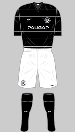 Ayr were relegated from the First Division last season. They have switched to Nike in familiar templates. The original publicity photos showed all-white and all-black strips but the manager decided to switch the shorts to achieve a more traditional look for the home kit.