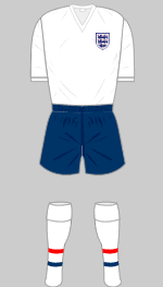 The red and white change kit was used several times, most famously, of course, in the 4-2 1966 World Cup Final triumph against West Germany. Two variants appeared - red shorts were worn in an away game against Belgium (25 Feb 1970) and white shorts and socks were used against Rumania (6 Nov 1968) and Bulgaria (1 June 1974).